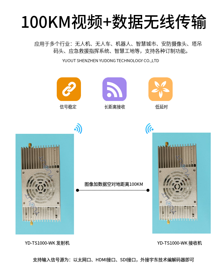 YD-TS1000-WK 是應(yīng)用于無人機行業(yè)的圖數(shù)控一體化超遠距離無線傳輸設(shè)備(最遠可達 15至20 公里),具有體積小、功耗低、通信距離遠等特點,支持高清視頻、飛控數(shù)據(jù)、云臺控制數(shù)據(jù)、遙控器控制數(shù)據(jù)等同時傳輸。