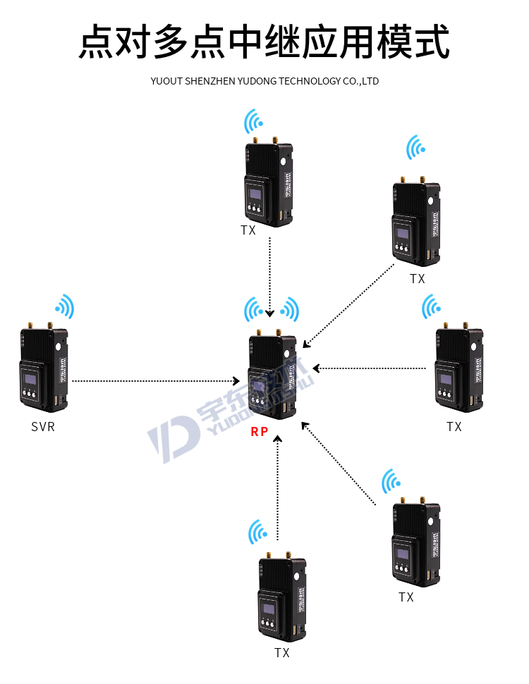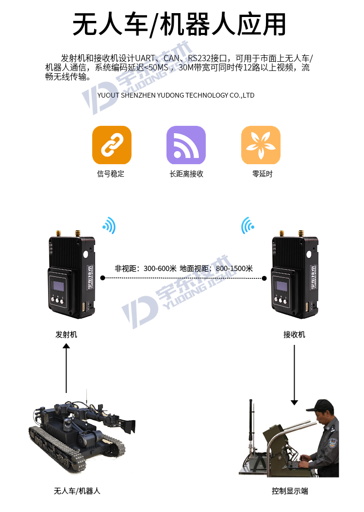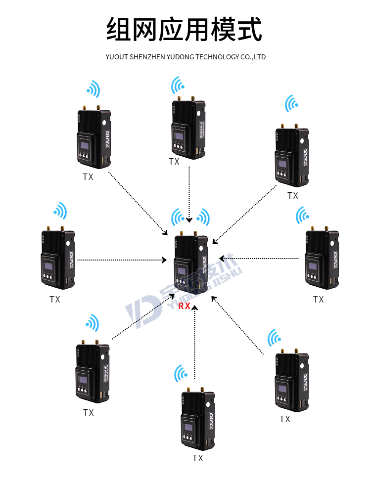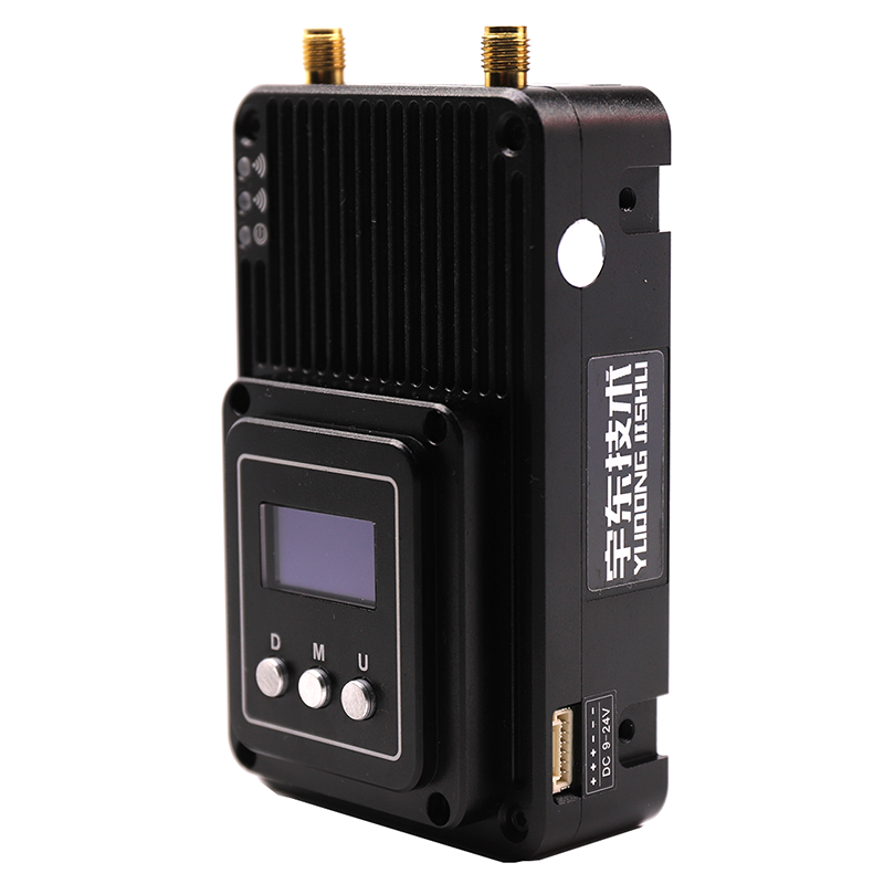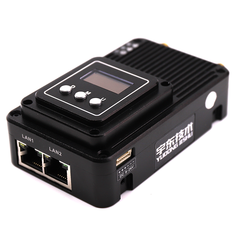 YD-TD8000-DT YUOUT video data wireless image transmission system adopts industrial-grade wireless high-speed data transmission technology, non-line-of-sight, non-wifi, set orthogonal frequency division multiplexing TDMA and MIMO multi-input and multiple-output capacity technology, completely based on IP Internet protocol, to achieve full bidirectional transparent channel broadband transmission. Non-visual distance: 300-600 meters; Ground visual distance: 800-1500 meters; Air-to-ground: 5000 meters. The system is pure hardware connection, plug and play; Innovative LCD integrated design, rich CAN bus, RS-232, TTL level interface, better user perspective experience. The channel supports a maximum throughput of 30Mbps, and can be widely used in industrial automation, industrial robots, drones, video surveillance and other communication work.