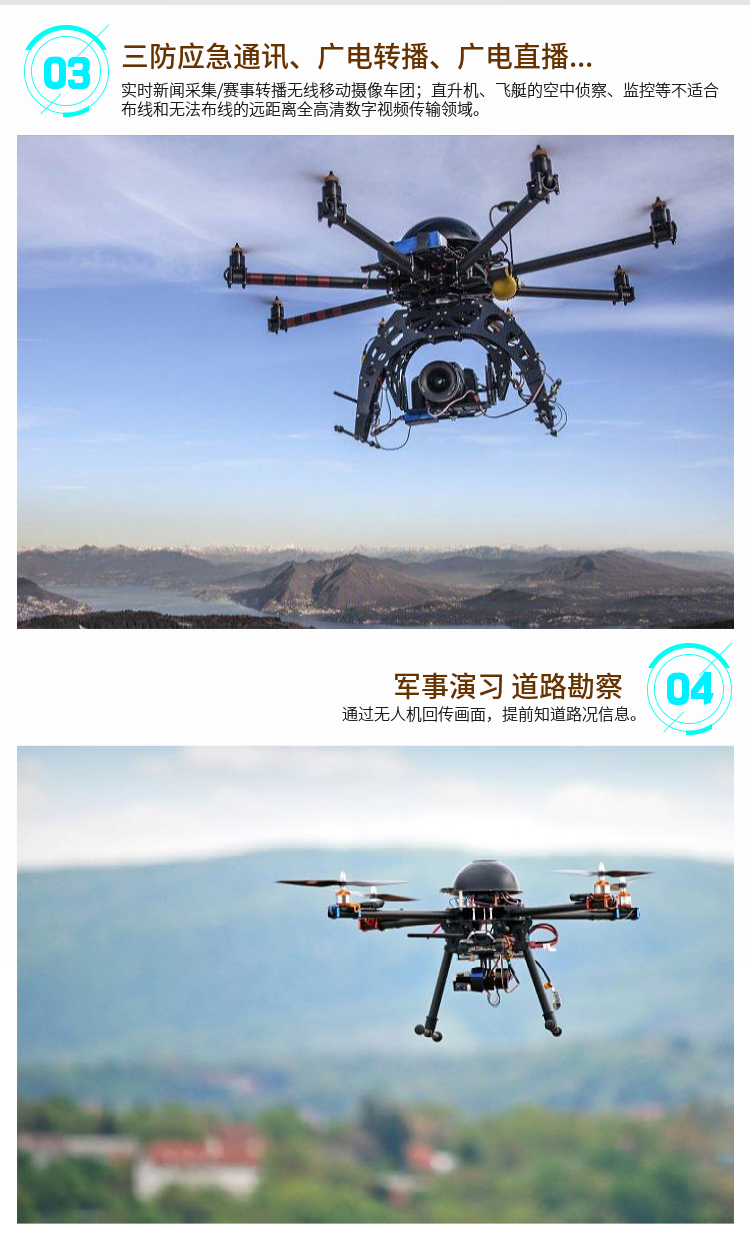 廣泛應(yīng)用于軍事偵察、邊防巡邏、公安技偵、航拍、空中測(cè)繪、電力巡查、鐵路搶險(xiǎn)、海事執(zhí)法、城管執(zhí)法、新聞密訪、衛(wèi)生防疫等或突發(fā)事件應(yīng)急指揮、無人車、無人船、特種機(jī)器人等領(lǐng)域。設(shè)備體積小可偽裝做密訪取證、空中作業(yè)圖傳、無人機(jī)無線圖像傳輸。